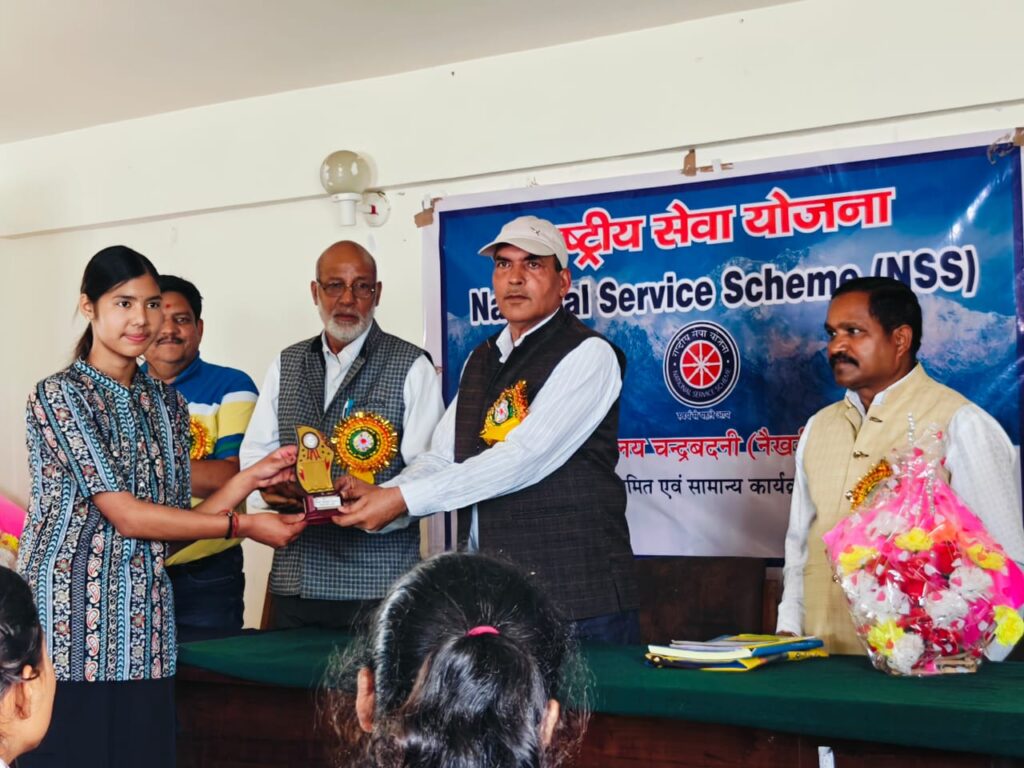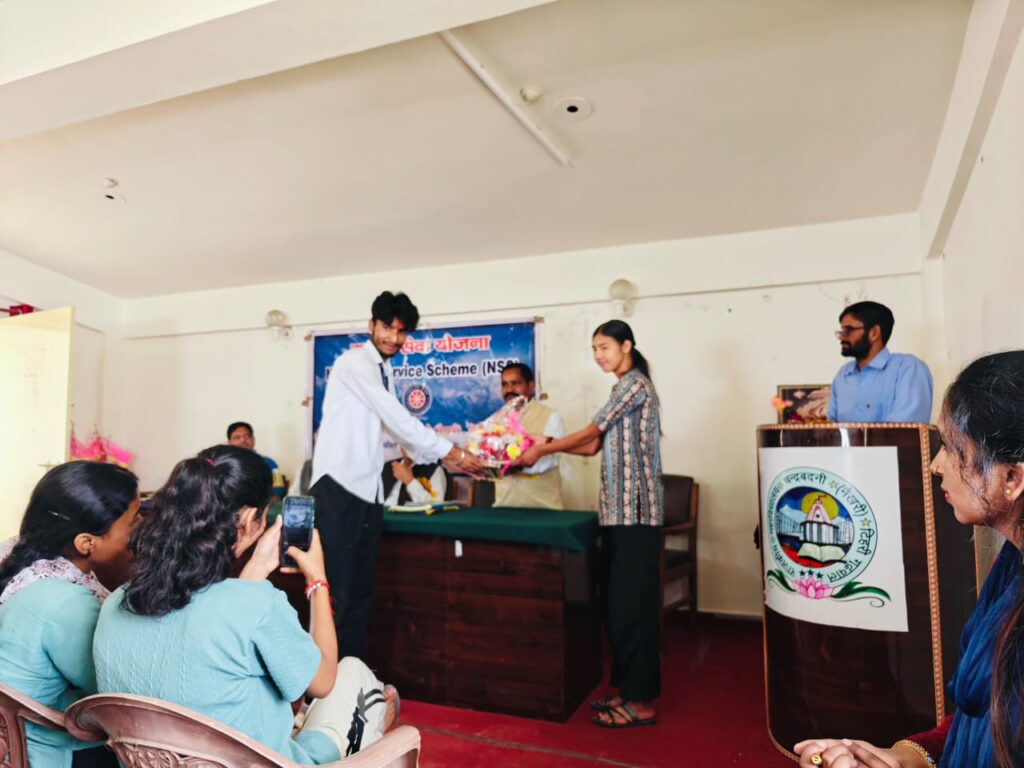 आज दिनांक 24.9.2025 को राष्ट्रीय सेवा योजना के स्थापना दिवस के शुभ अवसर पर श्री देव सुमन उत्तराखंड विश्वविद्यालय परिसर चंद्रबदनी (नैखरी) के प्राचार्य/प्रभारी निदेशक डॉ महन्थ मौर्य जी की अध्यक्षता में एनएसएस स्थापना दिवस शिविर का सफलता पूर्वक आयोजन किया गया।कार्यक्रम का शुभारंभ मुख्य अतिथि द्वारा दीप प्रज्जवलन तथा छात्राओं द्वारा सरस्वती वंदना के साथ किया गया। तत्पश्चात कार्यक्रम के मुख्य अतिथि, विशिष्ट अतिथि एवं परिसर के निदेशक महोदय का बैज अलंकरण किया गया।कार्यक्रम अधिकारी श्री एस० के० भट्ट द्वारा राष्ट्रीय सेवा योजना के परिचय, उद्देश्य एवं इतिहास के बारे में सभी को जानकारी दी गई। राष्ट्रीय सेवा योजना सलाहकार समिति के संयोजक डॉ दयाधर दीक्षित एवं वरिष्ठ प्राध्यापक डॉ पीएस बिष्ट जी ने छात्रों के चरित्र निर्माण एवं व्यवहारिक जीवन में एनएसएस के महत्व पर प्रकाश डाला। मुख्य अतिथि श्री जगदीश जी (विधिक सेवा प्राधिकरण टिहरी गढ़वाल) ने विधिक सेवाओं एवं सामाजिक समस्याओं जैसे नशा उन्मूलन, सड़क सुरक्षा, बाल अधिकारों आदि के बारे में विस्तार पूर्वक चर्चा की।नमामि गंगे कार्यक्रम के नोडल डॉ जी०पी० थपलियाल जी ने सभी स्वयंसेवी छात्राओं को स्वच्छ भारत के महत्व से अवगत कराया। आज के कार्यक्रम की अध्यक्षता कर रहे परिसर के निदेशक/ प्राचार्य महोदय द्वारा एनएसएस के महत्व पर प्रकाश डालते हुए सभी स्वयंसेवियों को राष्ट्र निर्माण तथा चरित्र निर्माण में एनएसएस की भूमिका से अवगत कराया गया। कार्यक्रम के अंत में सर्वश्रेष्ठ स्वयंसेवी छात्र राहुल झल्डीयाल एवं छात्रा अनामिका को मुख्य अतिथि द्वारा पुरस्कृत किया गया तथा कार्यक्रम का समापन “हम होंगे कामयाब” गीत एवं स्वच्छता रैली निकाल कर किया गया ।कार्यक्रम में समस्त महाविद्यालय उपस्थित रहा।