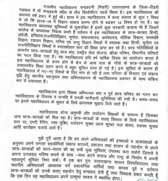 मैं एक बार पुनः उत्तराखण्ड शासन विश्वविद्यालय तथा स्थानीय अभिभावकों अध्यापक वर्ग प्रशासनिक कर्मियों तथा समस्त पूर्व व वर्तमान छात्र-छात्राओं को उनके सतत सहयोग हेतु धन्यवाद देता हूँ तथा विश्वास प्रकट करता हूँ कि एक दिन यह महाविद्यालय अपने उत्कृष्ट स्वरूप में स्थापित होगा।